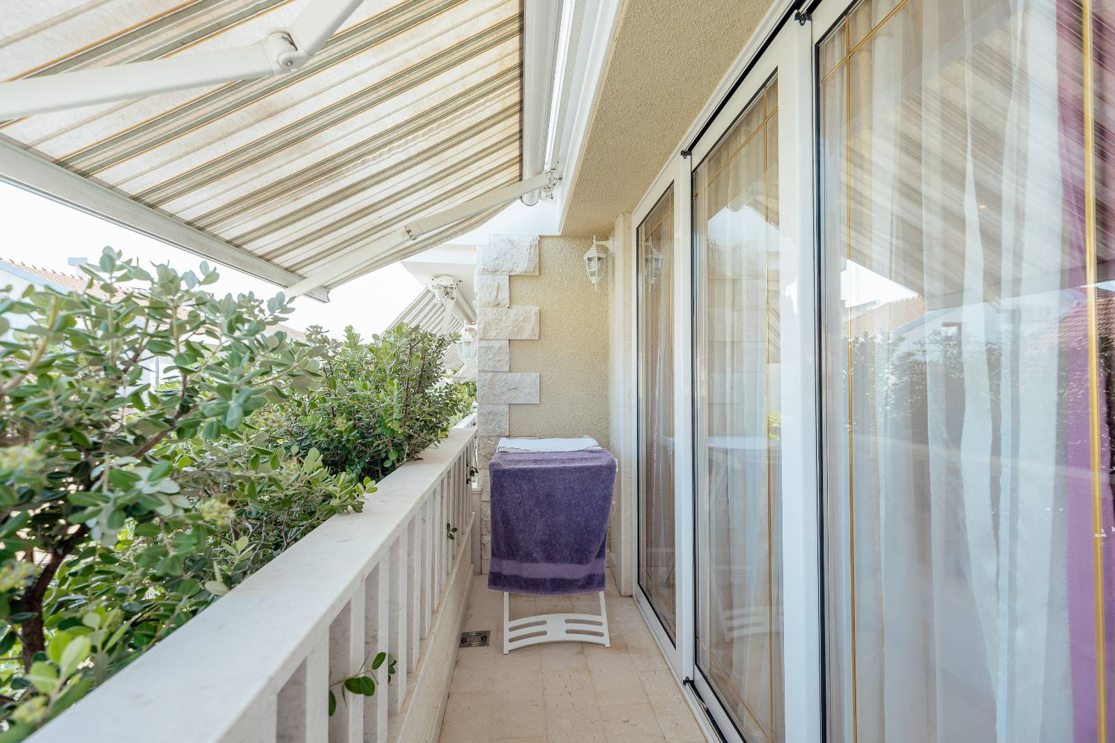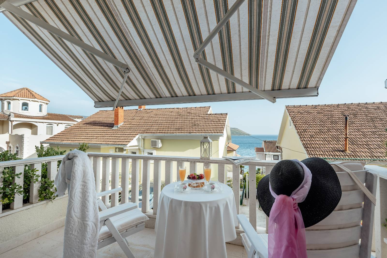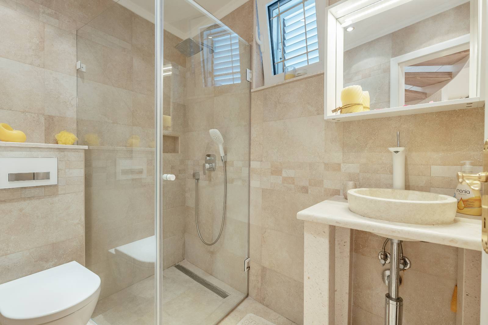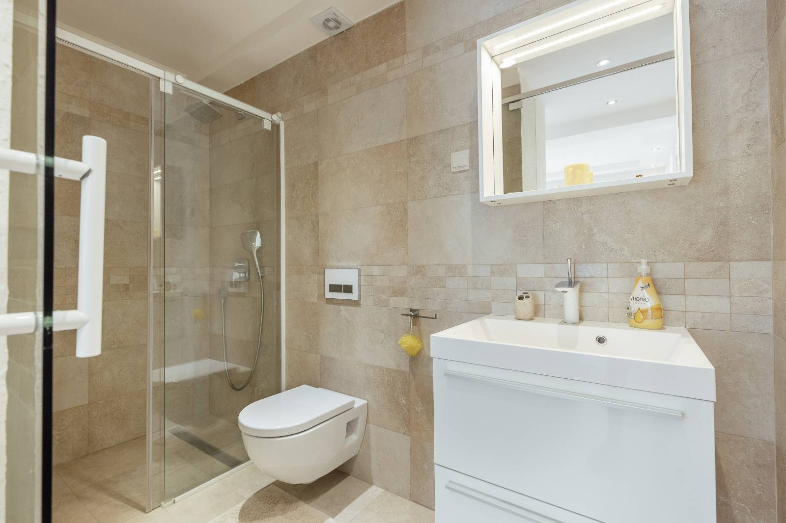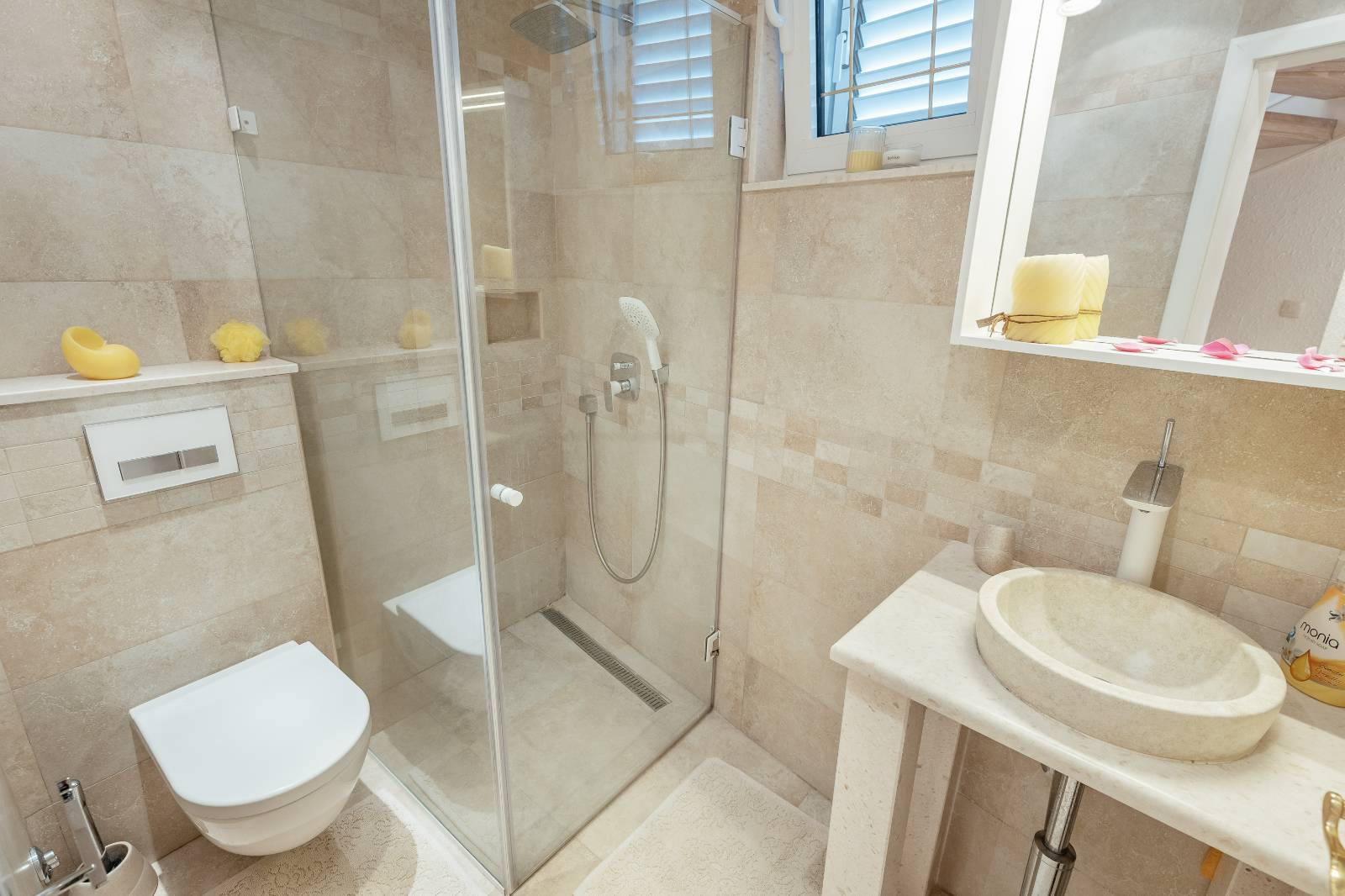 On the first floor, you’ll find a fully equipped kitchen with a dining area, a living room, and a bathroom.The second floor features two bedrooms, each with its own bathroom, a second living room with a pull-out sofa, and a terrace with a sea view.