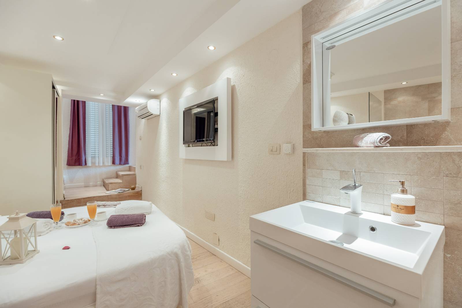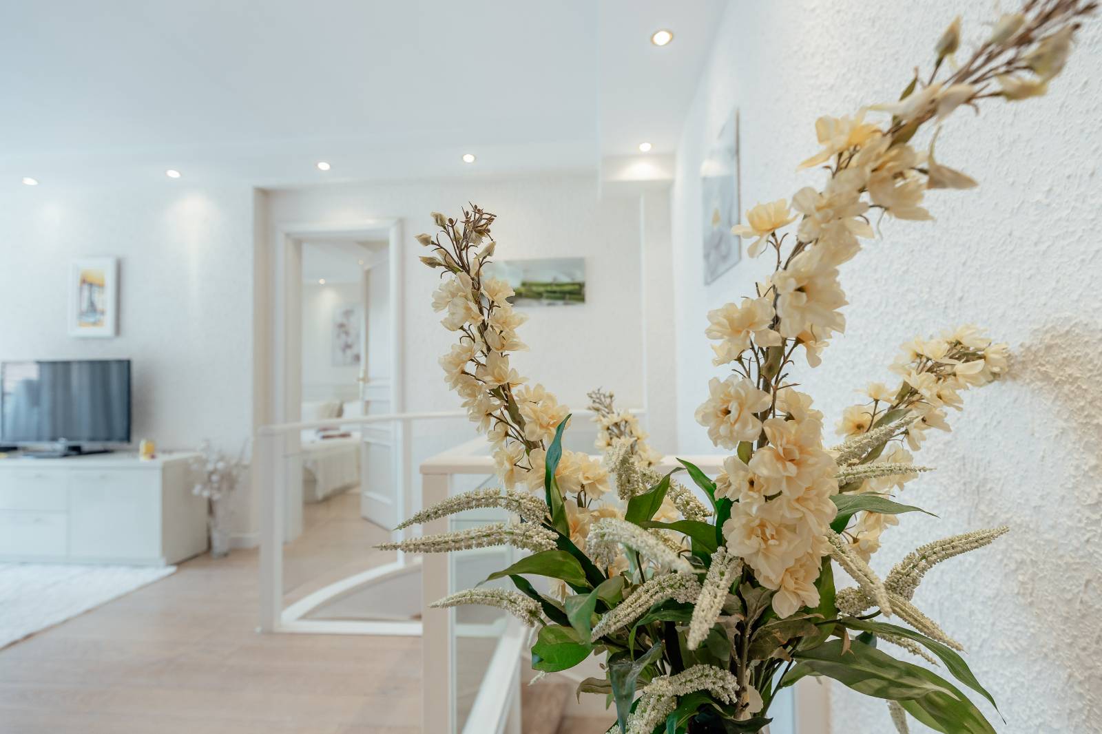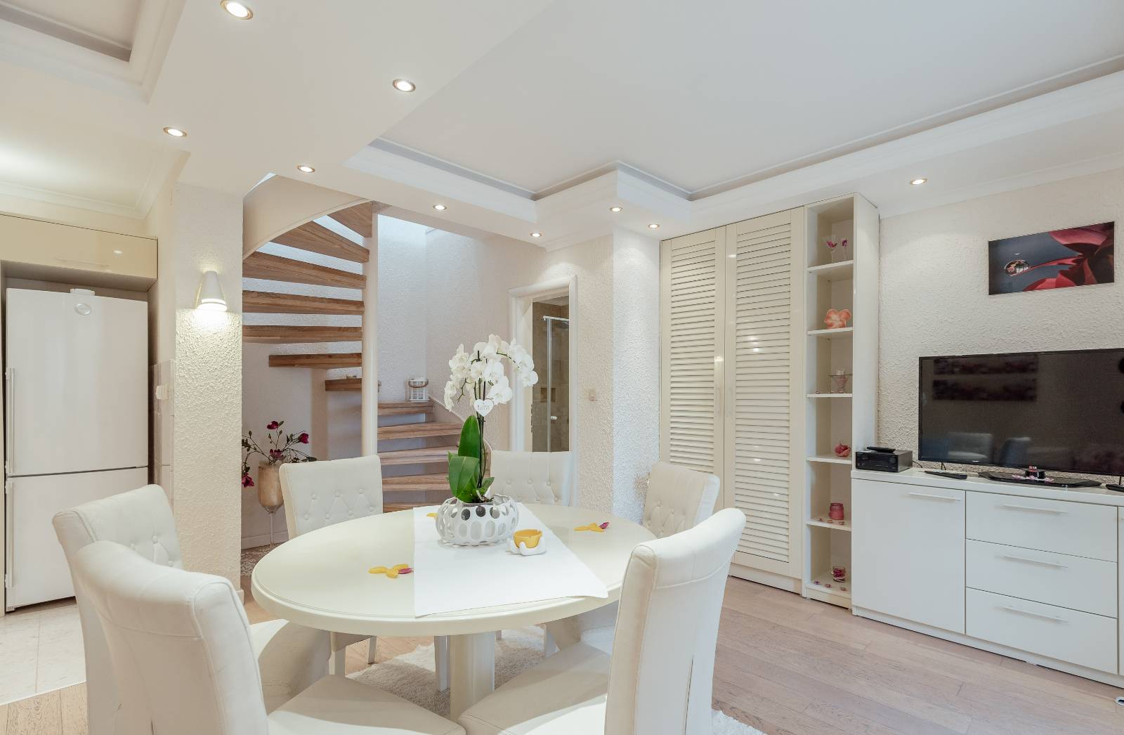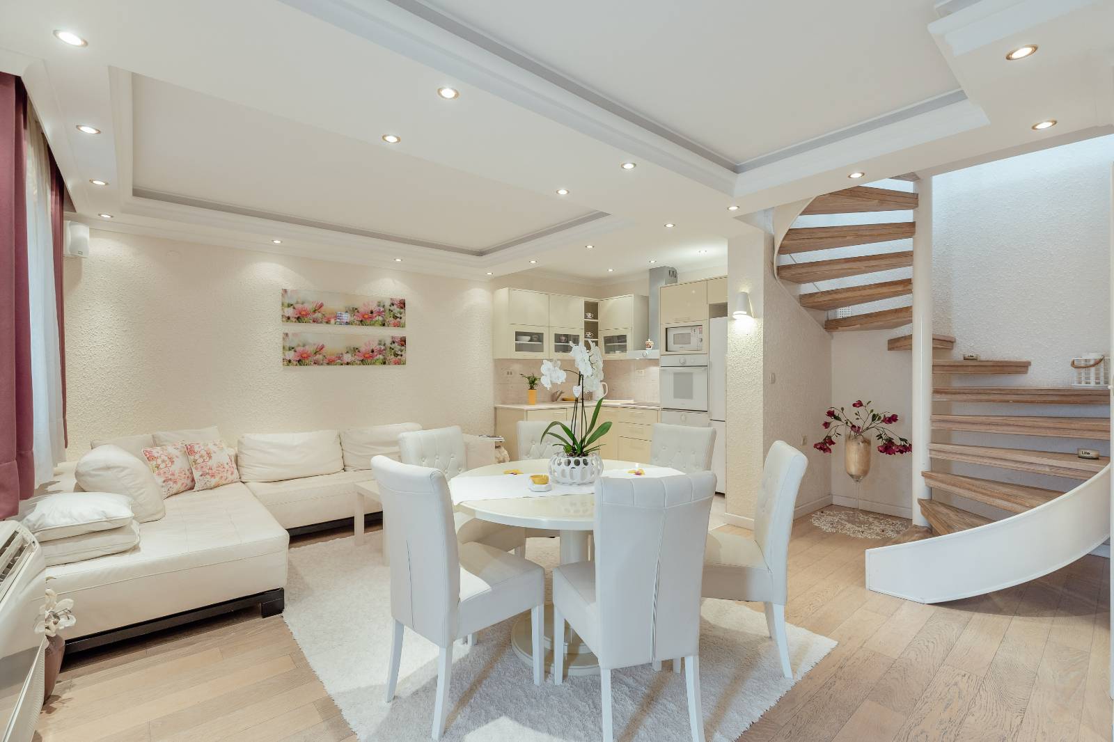 On the first floor, you’ll find a fully equipped kitchen with a dining area, a living room, and a bathroom.The second floor features two bedrooms, each with its own bathroom, a second living room with a pull-out sofa, and a terrace with a sea view.